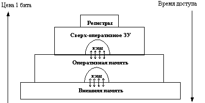 Память вычислительной машины представляет собой иерархию запоминающих устройств (внутренние регистры процессора, различные типы сверхоперативной и оперативной памяти, диски, ленты), отличающихся средним временем доступа и стоимостью хранения данных в расчете на один бит (рисунок 2.17). Пользователю хотелось бы иметь и недорогую и быструю память. Кэш-память представляет некоторое компромиссное решение этой проблемы.