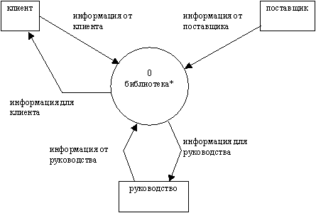 Из описания предметной области следует, что в процессе работы библиотеки участвуют следующие группы людей: клиенты, поставщики и руководство. Эти группы являются внешними объектами. Они не только взаимодействуют с системой, но также определяют ее границы и изображаются на начальной контекстной DFD как терминаторы (внешние сущности).