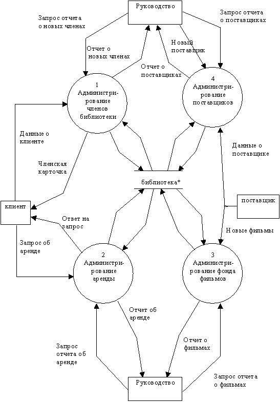 Например, в данном случае назначение ИС формулируется следующим образом: ведение базы данных о членах библиотеки, фильмах, аренде и поставщиках. При этом руководство библиотеки должно иметь возможность получать различные виды отчетов для выполнения своих задач.