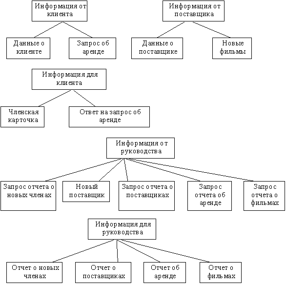 В качестве предметной области используется описание работы видеобиблиотеки, которая получает запросы на фильмы от клиентов и ленты, возвращаемые клиентами. Запросы рассматриваются администрацией видеобиблиотеки с использованием информации о клиентах, фильмах и лентах. При этом проверяется и обновляется список арендованных лент, а также проверяются записи о членстве в библиотеке. Администрация контролирует также возвраты лент, используя информацию о фильмах, лентах и список арендованных лент, который обновляется. Обработка запросов на фильмы и возвратов лент включает следующие действия: если клиент не является членом библиотеки, он не имеет права на аренду. Если требуемый фильм имеется в наличии, администрация информирует клиента об арендной плате. Однако, если клиент просрочил срок возврата имеющихся у него лент, ему не разрешается брать новые фильмы. Когда лента возвращается, администрация рассчитывает арендную плату плюс пени за несвоевременный возврат.