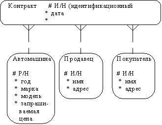 Обращаясь к приведенным выше выдержкам из интервью, видно, что сущности, которые могут быть идентифицированы с главным менеджером - это автомашины и продавцы. Продавцу важны автомашины и связанные с их продажей данные. Для администратора важны покупатели, автомашины, продавцы и контракты. Исходя из этого, выделяются 4 сущности (автомашина, продавец, покупатель, контракт), которые изображаются на диаграмме следующим образом (рисунок 2.19).