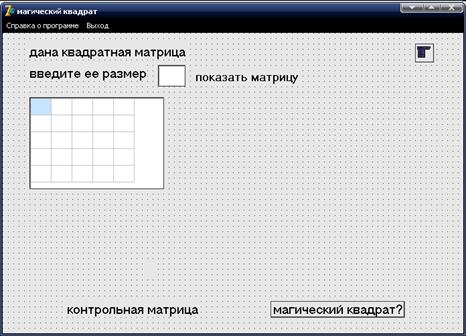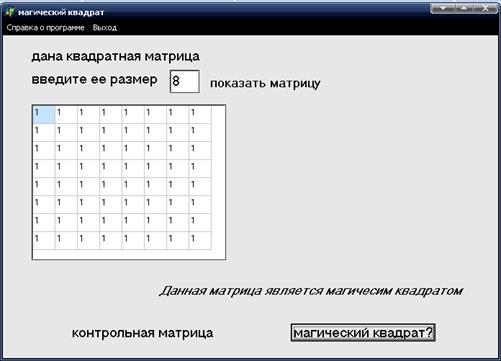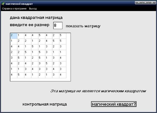 Программа запускается нажатием на файл Magi.exe. На открывающем окне формы расположен меню MainMenu, через которого можно открыть справки, помощь и закрыть программу. Ввод данных осуществляется с помощью случайных чисел. Нажатие на метку Показать вызывает процедуры формирования матрицы. Элементы матрицы и контрольной матрицы загружаются для отображения на форме в компонент StringGrid1.