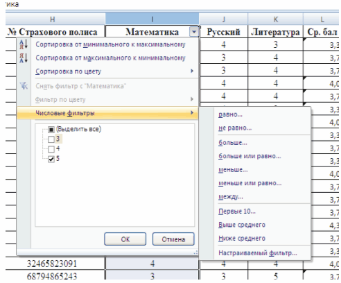 - отображение только тех строк таблицы, которое удовлетворяют ограничениям, установленным в одном из режимов подменю Числовые фильтры (рис.3.6).