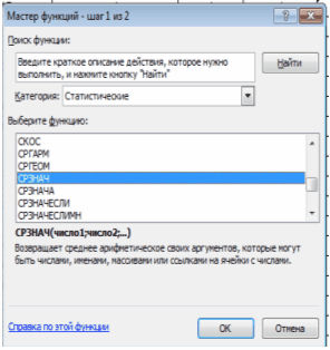 4. В группе «Выберите функцию» просматриваем список функций заданной категории и выбираем нужную, например «СРЗНАЧ»; (рис 3.7).