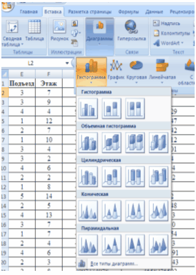 Построение диаграммы начинается с выбора диапазона тех данных, которые следует отразить. Затем на вкладке Вставка в группе Диаграммы выбирается кнопка типа создаваемой диаграммы (гистограммы, круговая, линейчатая и т.д.), которая предоставляет собой выпадающее меню с вариантами диаграмм (рис. 3.8).