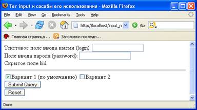 Текстовое поле ввода имени (login): <input type=text name=”login” value=””<br>