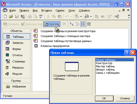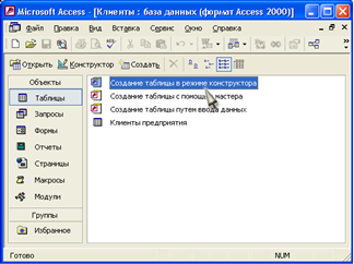 В Access используются три способа создания таблиц: путем ввода данных, с помощью Конструктора таблиц и с помощью Мастера создания таблиц. Для каждого из этих способов существует специальный ярлык новых объектов в списке таблиц. Если вы создали новый файл базы данных, то, кроме этих ярлыков, в списке таблиц больше ничего нет.