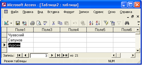 В поля этой таблицы нужно ввести требуемые данные. Тип данных в одном поле (столбце) во всех записях должен быть одинаковым.
