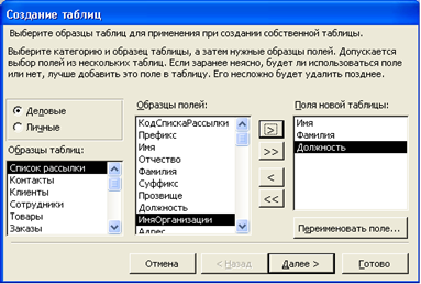 Переместить нужные поля из списка Образцы полей в список Поля новой таблицы. Для этого следует воспользоваться кнопками со стрелками: > - переместить одно поле, " - переместить все поля.