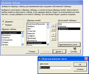 При необходимости переименовать какое-либо поле, нужно выделить его в списке Поля новой таблицы и нажать кнопку Переименовать поле, затем ввести в диалоговом окне Переименование поля новое имя поля и нажать кнопку ОК (Рис.6). Нажать кнопку Далее.