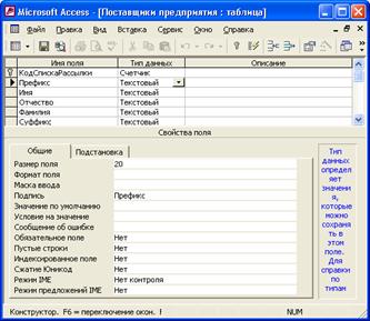 В нижней части окна Конструктора таблиц на вкладках Общие и Подстановка ввести свойства каждого поля или оставить значения свойств, установленные по умолчанию.
