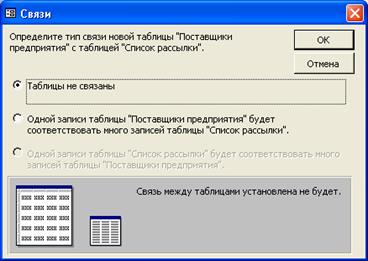 В окне Связи нужно выбрать тип связи с данной таблицей. Выберите переключатель Одной записи в таблице "Клиенты" будет соответствовать много записей таблицы "Список рассылки оповещений". Нажать кнопку ОК.