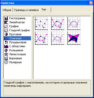 Для того чтобы изменить тип диаграммы, щелкните мышью в любом месте области диаграммы и убедитесь, что эта область выделена. Тогда становится доступна кнопка Тип диаграммы на панели инструментов. Нажмите эту кнопку. В диалоговом окне Свойства раскроется вкладка Тип. На ней представлены все типы диаграмм, которые могут быть построены. Выберите нужный тип из списка, а затем подтип справа и остановитесь на том типе, который вам больше нравится.