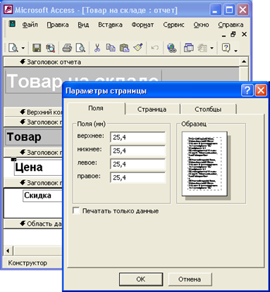 В режиме Предварительного просмотра отчета выберите команду Файл, Параметры страницы. Откроется диалоговое окно Параметры страницы.