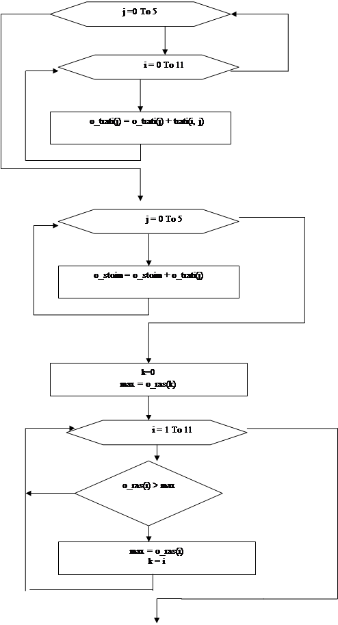 Определение самой "Ходовой ткани". Для этого используется два массива одинаковой размерности: "ras (12)" - в котором лежат количественные значения и "naz (12)" - в котором лежат названия тканей, а также две переменных "max" - в которой лежит максимальное значение ткани и "k " - порядковый номер ячейки с максимальным значением израсходованной ткани. На первом шаге мы предполагаем, что в первой ячейке массива "o_ras (i) находиться максимальное значение ложем его в переменную "max" и записываем номер ячейки в "k". На втором шаге мы начинаем сравнивать значение, содержащееся в "max" со значениями остальных ячеек, начиная с первой. Если мы нашли, что в какой - то ячейке значение больше, чем "max", то тогда это значение ложем в переменную "max" и записываем номер ячейки в "k".После того как мы прошли весь массив "ras (12)" и нашли максимальное значение, помощи переменной "k " мы берем из массива naz (12) наименование самой расходуемой ткани.