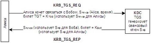 Клиент Kerberos, установленный на рабочей станции Алисы, запрашивает удостоверение на доступ к службе Боб, для чего посылает в службу KDC сообщение KRB_TGS_REQ (Kerberos Ticket-Granting Service Request - запрос к службе выдачи билетов Kerberos). В него включается имя пользователя, аутентификатор, зашифрованный с помощью сеансового ключа регистрации Алисы, билет TGT, который был получен с помощью подпротокола AS Exchange, а также имя службы, на доступ к которой нужен билет.