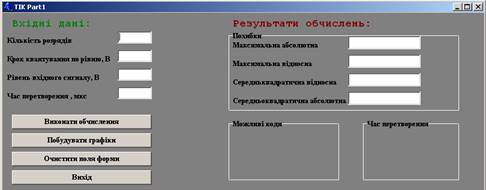 В результаті натискання даної кнопки виконуються обчислення похибок, генерація можливих кодів і обчислення часу перетворення для введених даних. Результати обчислень, як уже було зазначено вище, виводяться у відповідних полях: "Максимальна абсолютна", "Максимальна відносна", "Середньоквадратична відносна", "Середньоквадратична абсолютна", "Можливі коди" і "Час перетворення".
