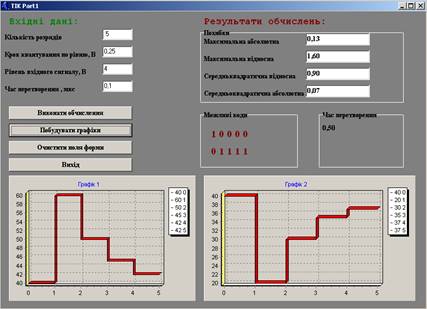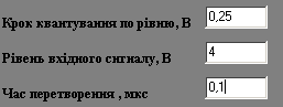 Аналогічно, в поля "Крок квантування по рівню", "Рівень вхідного сигналу" і "Час перетворення" також вводимо відповідні дані, задані в умові завдання.