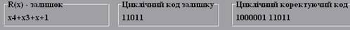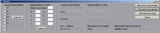 Наприклад, при введенні створюючого поліному і інформаційної частини таких, що були наведені в попередніх прикладах, після натискання кнопки "Виконати обчислення" матимемо у відповідних полях такі результати: