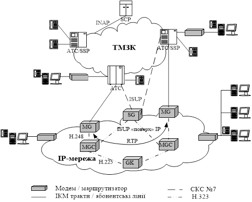Базуючись на стандартах Н.323 ITU-T для IP-мереж, специфікації TIPHON ETSI доповнюють їх деякими обов'язковими процедурами, а також механізмами взаємодії з мережами комутації каналів. Функціональна модель TIPHON складається з тих самих компонентів, що й модель Н.323, однак у ній передбачений розподіл шлюзу на три мережні елементи: шлюз сигналізації (SG – SignallingGateway), транспортний шлюз (MG – MediaGateway) і контролер транспортного шлюзу (MGC – MediaGatewayController). Схему взаємодії елементів архітектури TIPHON із телефонною мережею наведено на рис. 2.