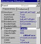Окно Инспектора Объектов позволяет изменять свойства (характеристики) компонентов (рисунок 3.4). Инспектор Объектов состоит из двух страниц, каждую из которых можно использовать для определения поведения данного компонента. Первая страница - это список свойств, вторая - список событий. Свойствами объекта являются, например, его размер, положение на экране или на форме, текст заголовка или текст на командной кнопке, цвет и т.д. Событие - это то, что происходит во время работы приложения. В Delphiу каждого события есть имя. Например, щелчок кнопкой мыши – это событие OnClick, двойной щелчок - событие OnDblClick. В Delphi реакция на событие реализуется как процедура обработки события.