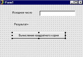 Само по себе внесение данных в строку ввода не приведет к их обработке. Для того, чтобы это произошло, нужно использовать компонент Button – кнопку. Этот компонент предназначен для формирования события при нажатии на эту кнопку. На рисунке 3.6 представлена форма с кнопкой Button1. СвойствоCaption этой кнопки – "Вычисление квадратного корня".