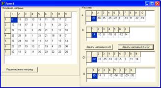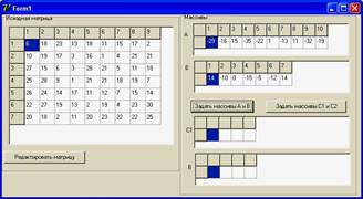 4) Формируются новые массивы С1 и С2, методом объединения соответственно второй части массива А с первой массива В, и наоборот.