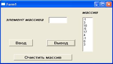 Это означает, что нажатие кнопки приводит к добавлению одного элемента из окна Edit в массив. При выполнении последующих действий по обработке массива значение переменной i определит количество элементов массива. Начальное значение i=0можно задать в разделе описания типизированных констант или в методе OnCreateдля формы (см. ниже) и сбрасывать его каждый раз при вводе нового массива. В массив запишется столько элементов, сколько раз будет нажата кнопка ввода. Если не сбрасывать значение i, то даже после обработки массива можно продолжить ввод элементов в массив.