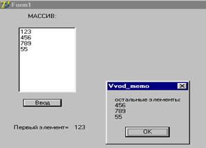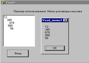 В отличие от строки ввода, текстовый редакторMemo может содержать любое количество строк. Егосвойство text представляет собой строку, состоящую из находящихся в поле Memo строк, разделенных последовательностью символов с кодами 13 и 10 (конец строки и переход на новую строку). Эти символы добавляются в поле Memo при нажатии клавши Enter. Для выделения подстроки, содержащей элемент массива, нужно найти символ с кодом 13 (#13), скопировать в новую подстроку, а затем удалить ее вместе с кодами 13 и 10 и продолжить поиск конца строки.