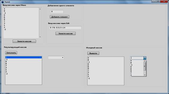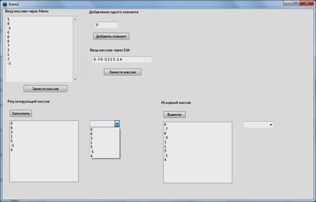 Вывод массива выполнить с помощью компонент ListBoxи ComboBox. Выводить нужно как исходный массив, так и результирующий.