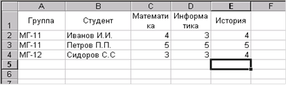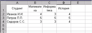 Пример 1. Найти средний балл каждого студента. Информация о результатах сдачи сессии представлена в списке рис.5. Решить эту задачу возможно только с помощью ввода расчетной формулы "средний балл".