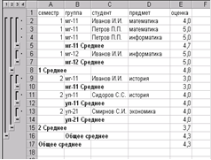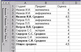 - отсортировать данные по двум ключам "Студент" и "Предмет". Если этого не сделать, получим неверный ответ: по ст. Иванову И.И. и Петрову П.П. будет выдано 2 средних оценки - после 1-ой и 3-ей, 2-ой и 6-ой записями соответственно;
