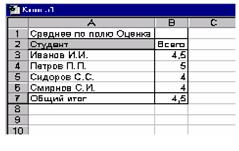 - в строке заголовков полей вводится новый заголовок "средний балл" (ячейка Е1);