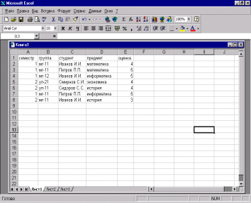 Пример 2. Данные организованы в виде списка, представленного на рис.10. Необходимо составить отчет о результатах сдачи сессии студентами по семестрам.