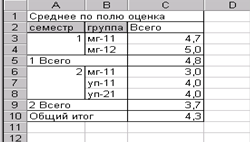Двойное обращение к механизму "Промежуточные итоги" связано с необходимостью получения итогов по двум полям: Семестр и Группа - а снятие флажка в опции