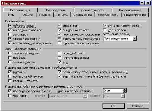 Для настройки параметров выбирается пункт меню Сервис => Параметры . Откроется диалоговое окно Параметры с множеством вкладок.