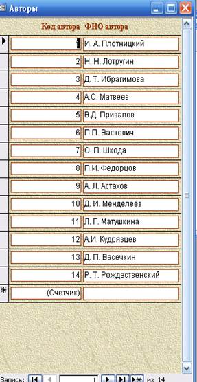 В первую очередь вносятся данные в таблицы, стоящие на стороне 1 (Авторы, Типы изданий, Отрасли знаний). Затем вносятся данные в таблицу Каталог. И ввод и редактирование данных можно осуществлять либо через закладку «Таблицы», щелкнув 2 раза по названию нужной таблицы. Либо путем открытия соответствующей формы для ввода данных.