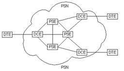 Спецификация Х.25 определяет двухточечное взаимодействие между терминальным оборудованием (DTE) и оборудованием завершения действия информационной цепи (DCE). Устройства DTE (терминалы и главные вычислительные машины в аппаратуре пользователя) подключаются к устройствам DCE (модемы, коммутаторы пакетов и другие порты в сеть PDN, обычно расположенные в аппаратуре этой сети), которые соединяются с "коммутаторами переключения пакетов" (packet switching exchange) (PSE или просто switches) и другими DCE внутри PSN и, наконец, к другому устройству DTE (Рис.1).