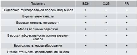 Использование технологии FR обеспечивало ряд преимуществ по сравнению с технологиями X.25 и ISDN, которые использовались для обеспечения доступа к распределенным вычислительным ресурсам. В таблице приведены результаты сравнения вышеописанных технологий по некоторым параметрам с технологией FR.