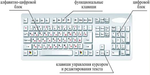 - специальные управляющие клавиши: переключение регистров, прерывание работы программы, вывод содержимого экрана на печать, перезагрузка ПК и т. д.;