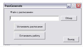 В соответствии с заданием и для большего удобства и понятия принципа работы программы интерфейс должен содержать наименьшее количество кнопок. Вследствие чего выберем: 1 поле, в котором будет вводиться имя файла с расписанием, одну кнопку после нажатия, которой будет происходить запуск программ, кнопку для приостановления работы, копку обзора, а также кнопку выход. Данная разработка представлена на рисунке 1.