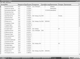 Таблица Students содержит следующие поля: Номер, ФИО, Факультет, Курс, Группа, Поощрения, Сумма, Дата выдачи, Примечание, Поездки, Примечания.