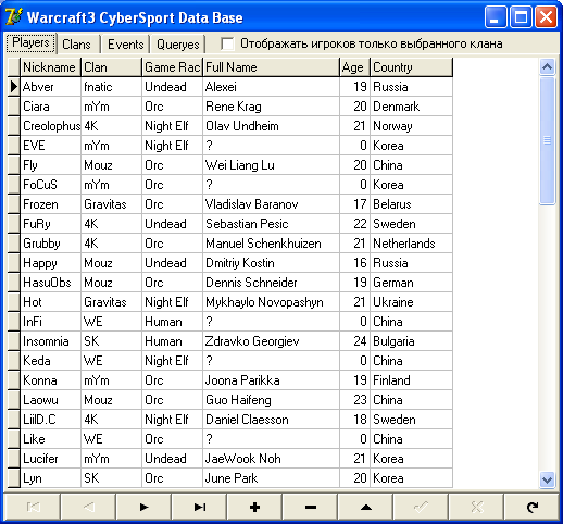 Players (NickName, Clan, Game Race, Full Name, Age, Country).
