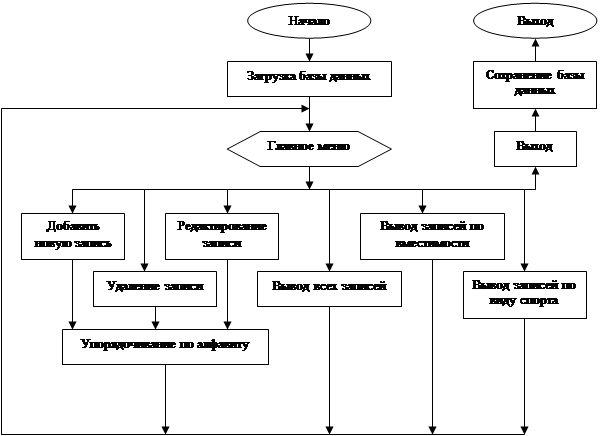 В основной программе осуществляется загрузка базы данных в массив и вывод главного меню. Далее пользователю предлагается выбрать один из пунктов: