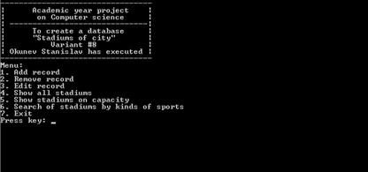 Курсовая работа: Курсовая работа: Создание базы данных "Стадионы города" на языке C