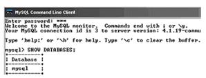 1. Создание базы и таблиц. Откроем консоль MySQL. Введем имя пользователя и пароль. Выведем список созданных баз данных.