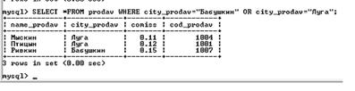 mysql> SELECT * FROM prodav WHERE city_prodav="Бабушкин" OR city_prodav="Луга";
