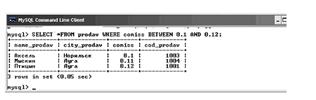 mysql> SELECT * FROM prodav WHERE comiss BETWEEN 0.1 AND 0.12;