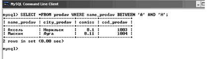 mysql> SELECT * FROM prodav WHERE name_prodav BETWEEN 'А%' AND 'Н%';