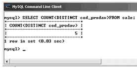 mysql> SELECT COUNT(DISTINCT cod_prodav) FROM sale;